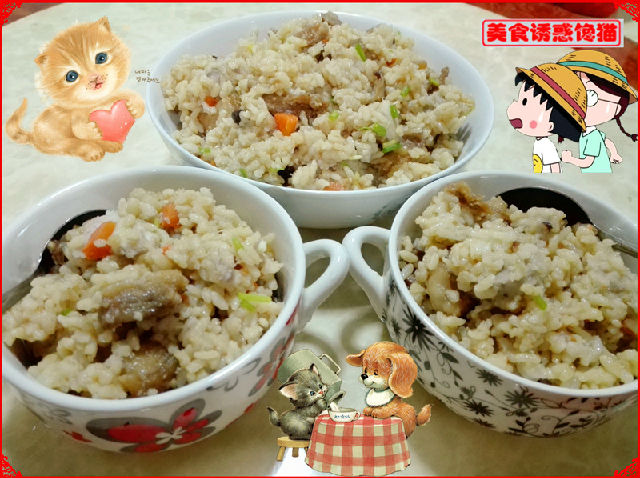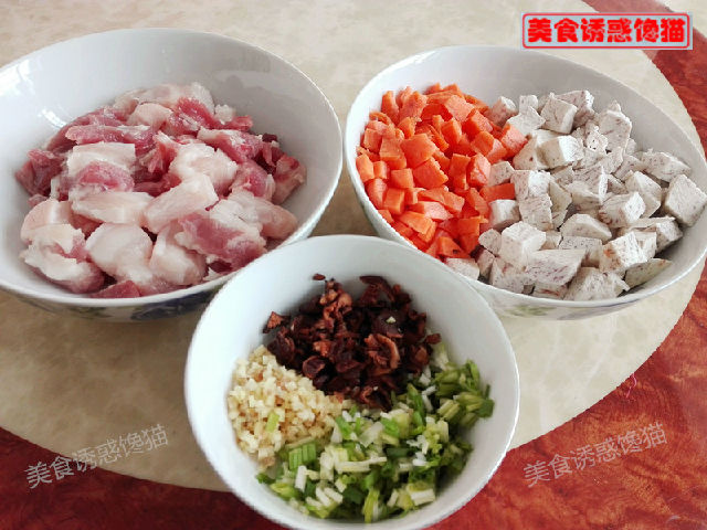 主料:五花肉200克、大米300克、香芋1個(gè)、胡蘿卜1個(gè)