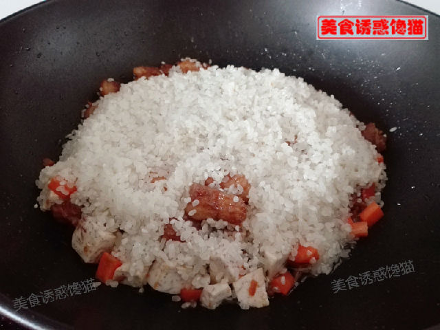 6、放入洗好的大米,翻炒勻。