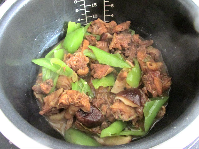 8,中間快到時(shí)間時(shí)加入粉絲,香菇和青辣椒,再燉5分鐘加鹽調(diào)味即可出鍋。