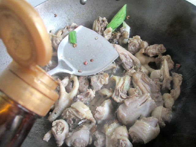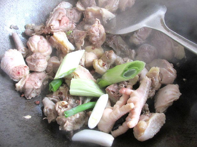 4,下入老雞煸炒,一定要多煸炒一會(huì)。