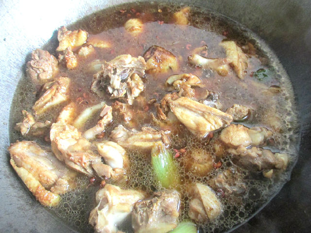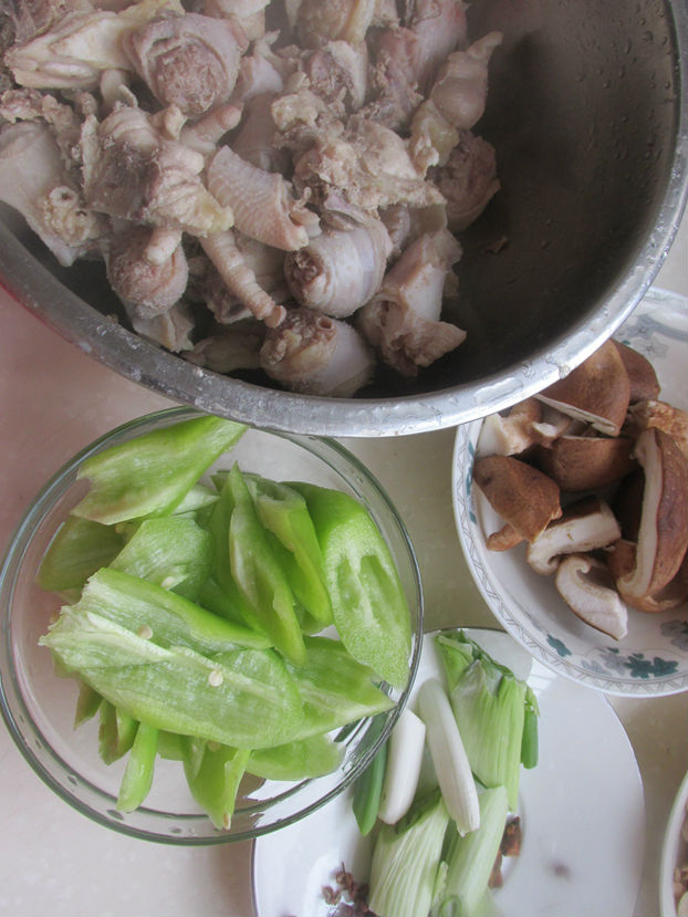老雞半只,香菇幾朵,青辣椒2個(gè),粉絲1把,老抽,大料,花椒,姜,蔥,鹽,花生油。