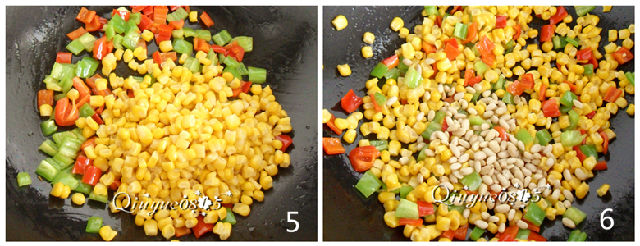 6.最后放入松仁,調(diào)入鹽和糖炒勻