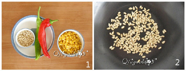 1. 清水泡一下甜玉米;紅綠椒清洗干凈;松仁備用。