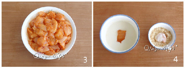 4. 裹炸粉兌水調(diào)成面糊(水面比例為2:1),把雞丁均勻的蘸上面糊,然后沾上細(xì)碎的燕麥片或面包糠。