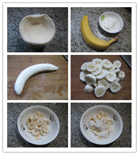 做法:(1)將香蕉剝皮,放在案板上切開。