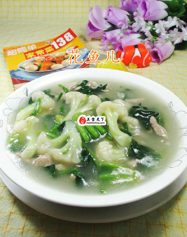 食材:里脊肉(已切)、花菜(已清洗)、菠菜(已洗凈切開)、水淀粉