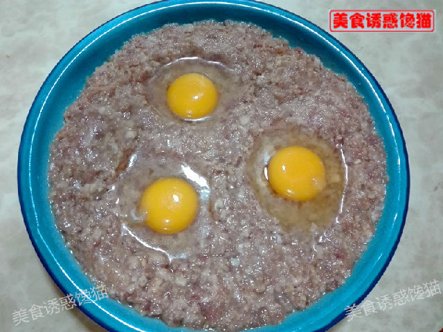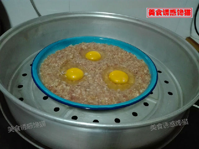 3、盤子里面抹上油,把攪拌好的肉泥鋪在盤子里,打上3個雞蛋。