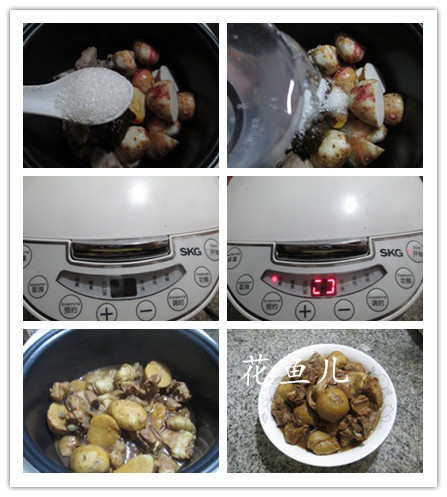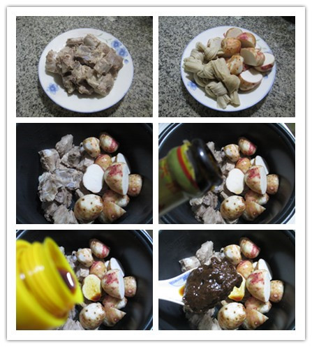 做法:(1)將已焯好的排骨和切好的香芋下入電飯鍋的內(nèi)膽中。