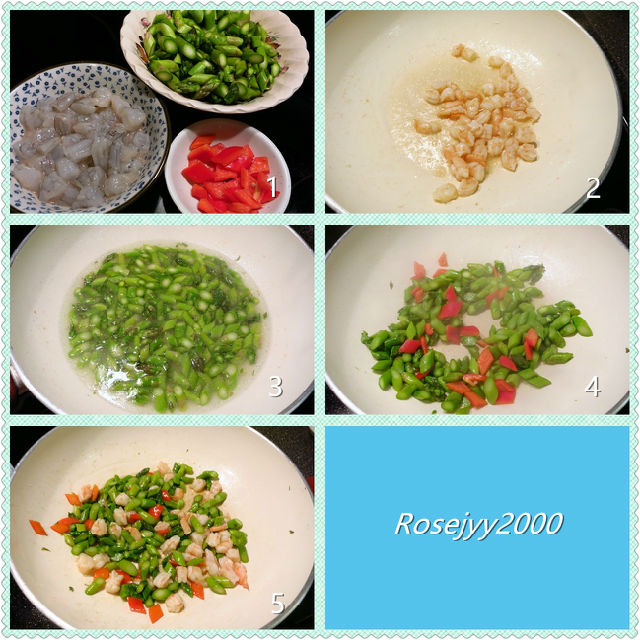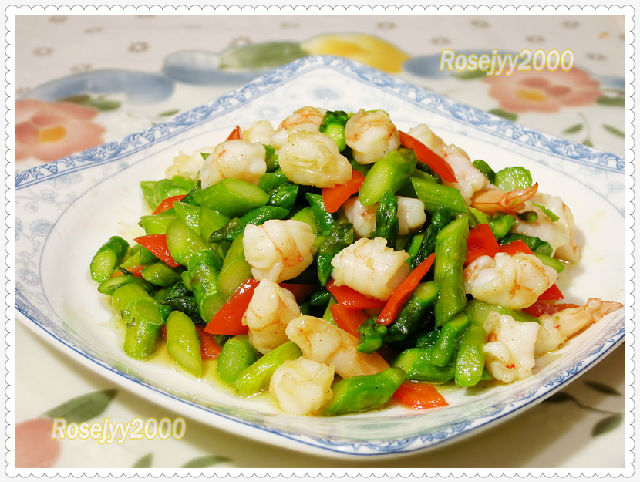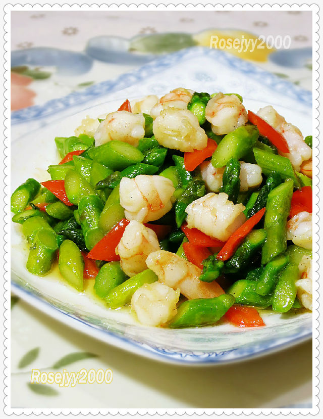 食材:蘆筍約300克,紅菜椒1/2只,蝦仁約150克。