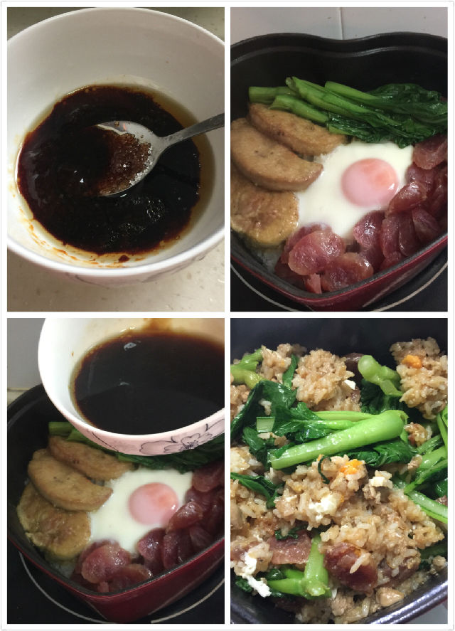 8、等米飯煮到水快收干時(shí),放入臘腸加蓋小火煮10分鐘