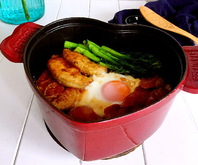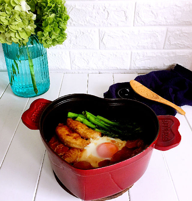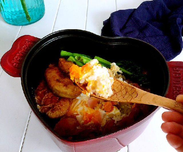 9、再把煎好的鵝肝放在米飯上,再加入一個(gè)雞蛋,繼續(xù)用小火燜煮5分鐘左右