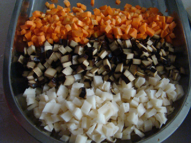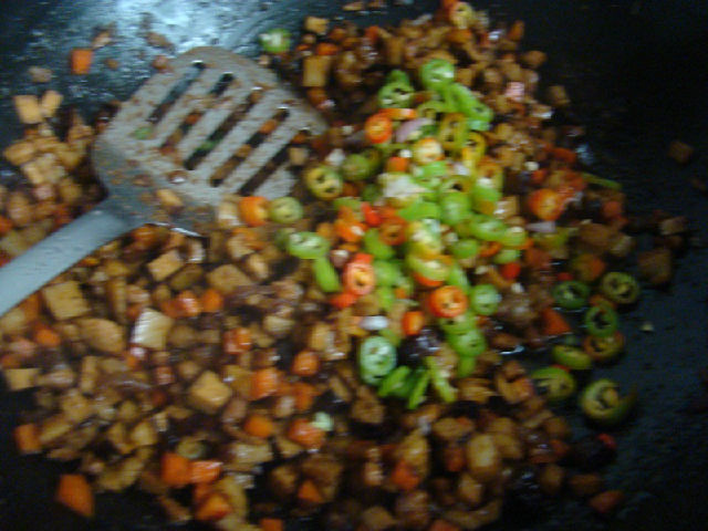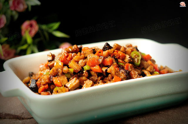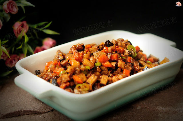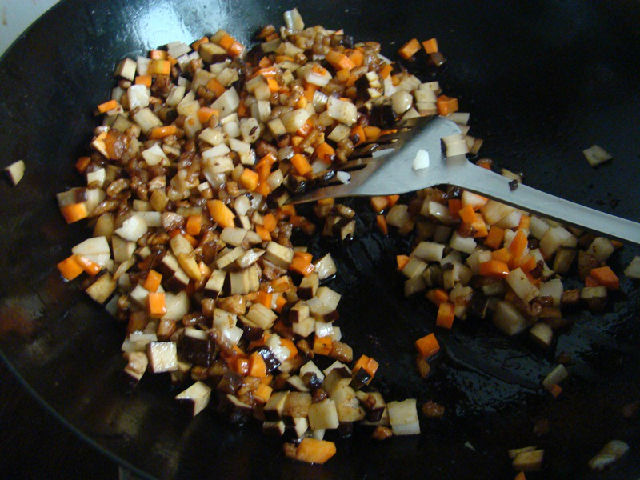 15,加入醬油,炒肉粒上色后,下入紅蘿卜丁、藕丁、豆干丁一起翻炒。