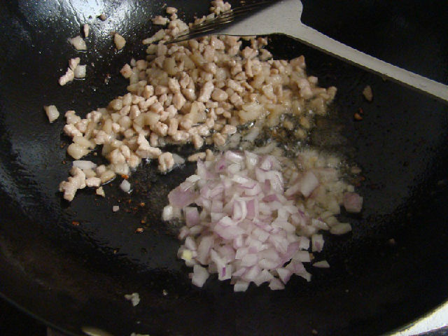 14,炒鍋上火,加少許底油,三成熱時下入肉粒煸香煸酥。然后撥到一邊,下入洋蔥炒出香味。