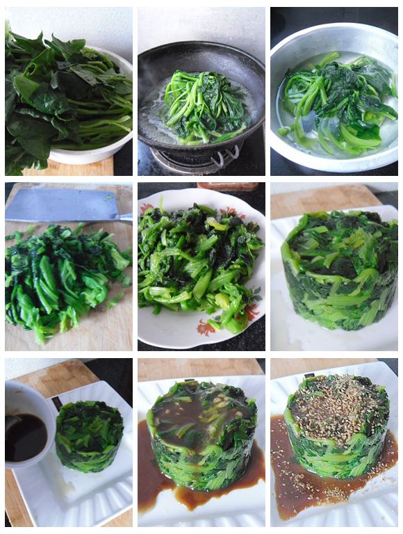 11、焯至菠菜塌秧。12、撈出過(guò)冷水(純凈水)。13、攥干水分后、切段。