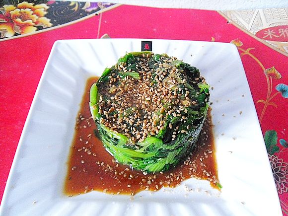 14、用圓柱模具壓出菠菜墩。15、澆上醬料汁。撒芝麻鹽,即可上桌。