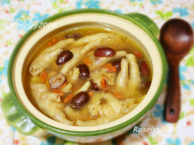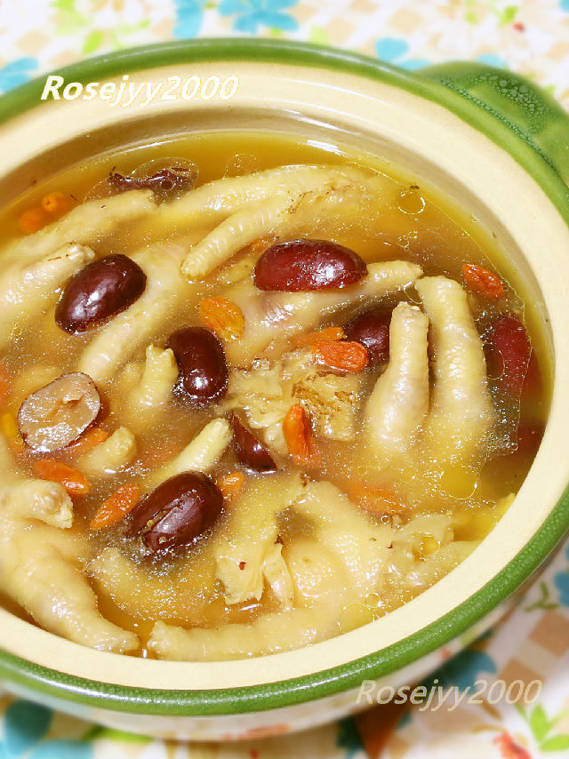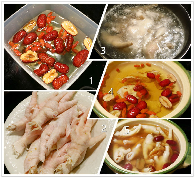 食材:鳳爪10只,紅棗5粒,當(dāng)歸3片,杞籽1撮,姜2片。