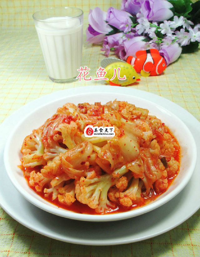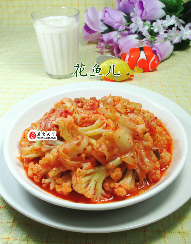 做法:(1)將已清洗好的花菜下入清水鍋中焯開至熟,撈出。