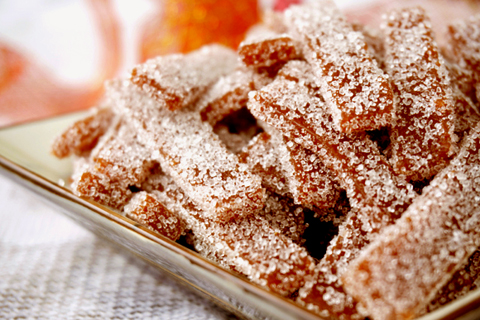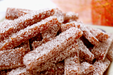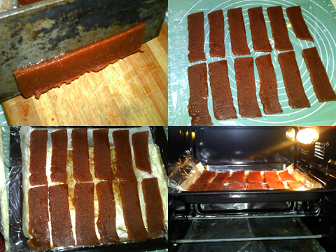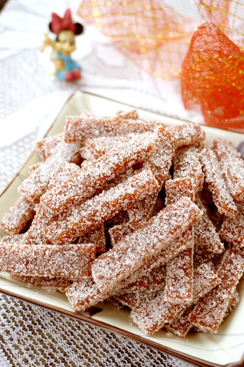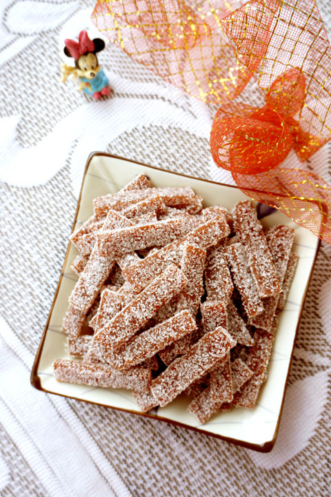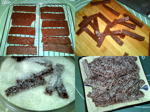 先前的山楂糕據(jù)說不夠甜,忽然就有了個(gè)新想法。記憶中,有一種山楂條/片上布滿了雪花般的砂糖,咬在嘴里咯吱咯吱。索性就把這山楂糕變成沾滿砂糖的山楂條。方法很簡單,山楂糕切片,放烤箱里烘干,然后在糖堆里滾上一圈。口味變甜了,口感也豐富了。。。。