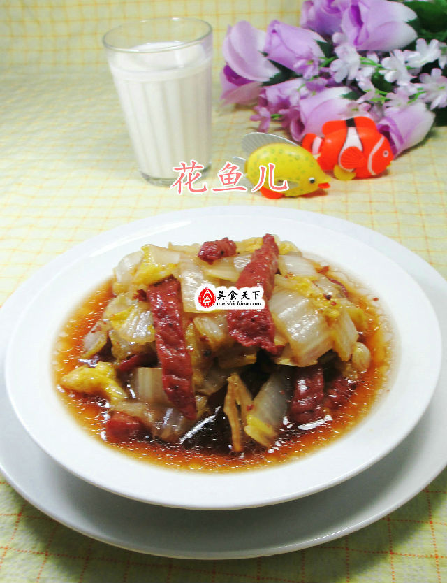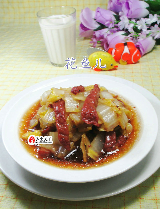 (2)接著,下入切好的白菜,加適量的清水翻炒翻炒至熟。