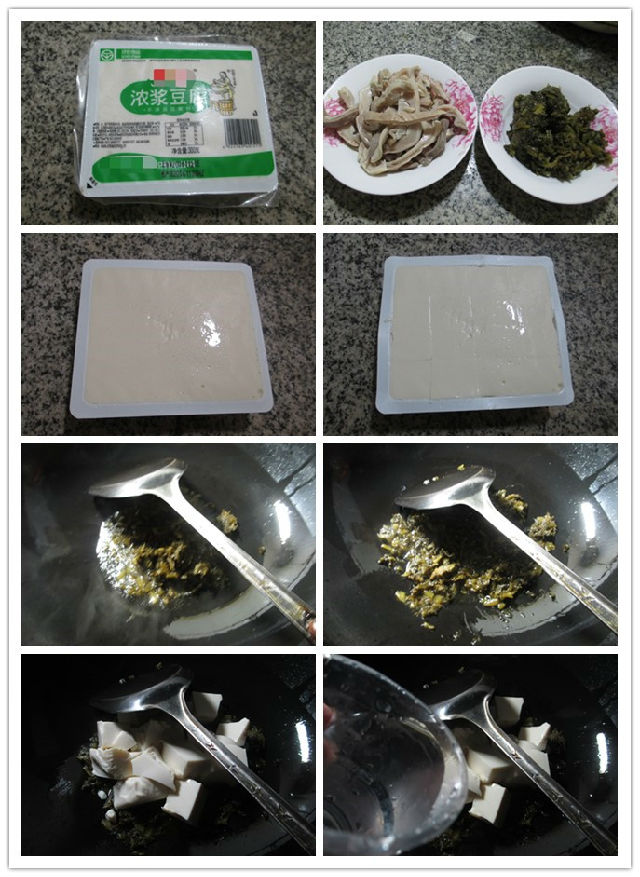 做法:(1)將豆腐撕開包裝、用刀劃開,待用。