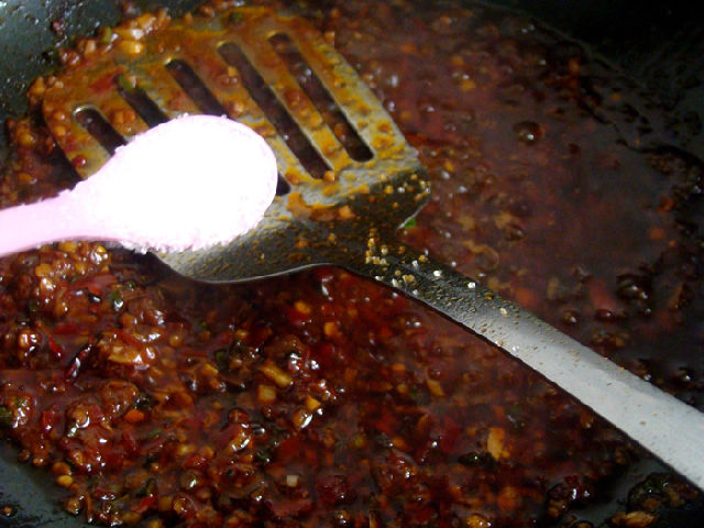 5,把鍋內(nèi)多余的油倒出,留少許底油,5成油溫時(shí)下入郫縣豆瓣醬煸出紅油,放入蔥姜蒜末炒出香味。