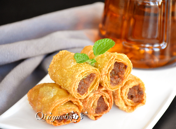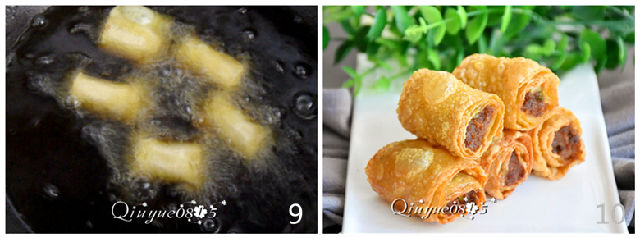 9.炒鍋倒入菜籽油,微微冒過小煙,待油燒至五成熱時放入卷好的油皮卷兒,用筷子翻動,中火炸至金黃,沸油出鍋控油。
