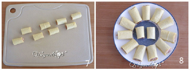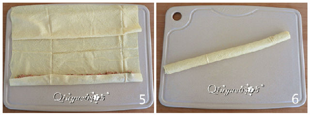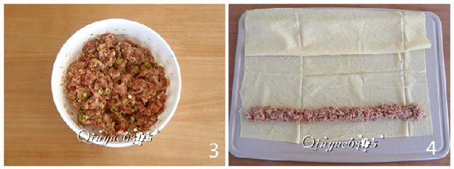 4.油皮鋪開,把拌好的豬肉餡如圖碼排在油皮一側(cè)。
