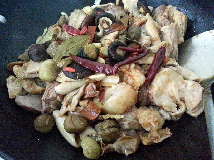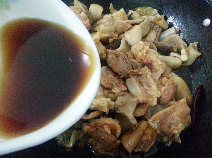 炒出糖色后倒入羊肉及羊肚,并倒入香料及香菇、栗子。翻炒一會