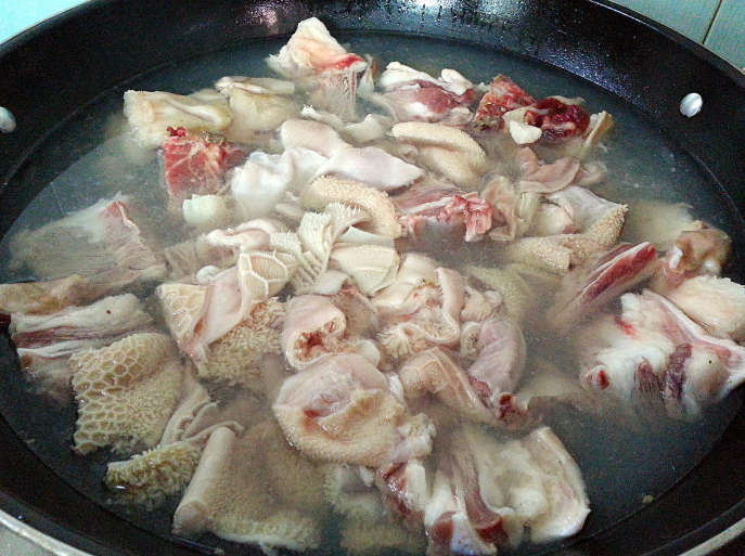 把羊排肉與羊肚處理好,在滾水里穿燙一會 撈出。以減輕羊騷味并且能洗洗干凈