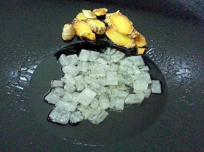 在爆好姜后把姜推一邊,放入冰糖炒出糖色