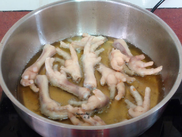 2.汆燙好雞爪一定要吸干水份,炸的時(shí)候才不會(huì)有油濺出;