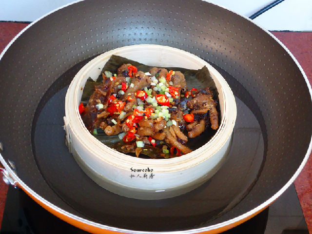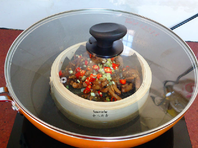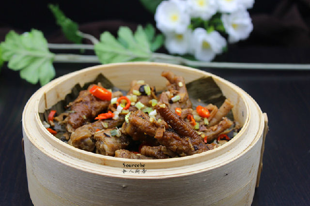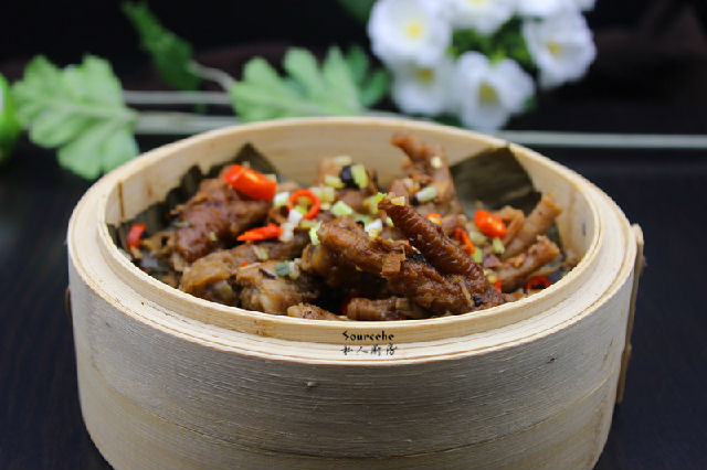 7.拌均好鳳爪放入蒸籠中;PS:蒸籠底可以墊上荷葉或粽子葉。