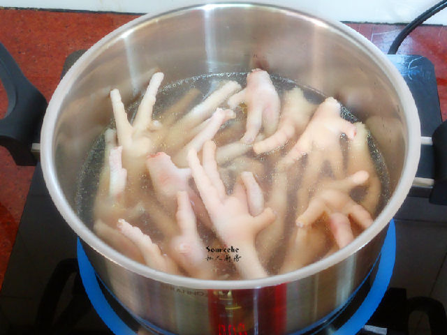 2.清水煮沸,放入雞爪汆燙去污血;