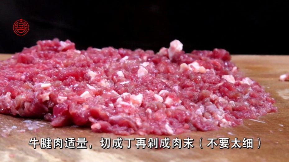 2、牛腱肉適量,切成丁再剁成肉末(不要太細)。