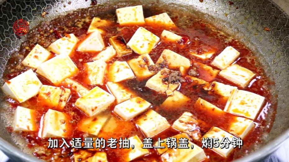 4、鍋熱去油,下入蒜蓉、姜末、豆瓣醬、豆豉中小火炒香,炒香后倒入辣椒粉,一起炒香。再下入牛肉,將牛肉炒干水份,直到爆出香味。牛肉爆香后加入適量的水,下入豆腐塊扒均,加入適量的老抽,蓋上鍋蓋,燜5分鐘。