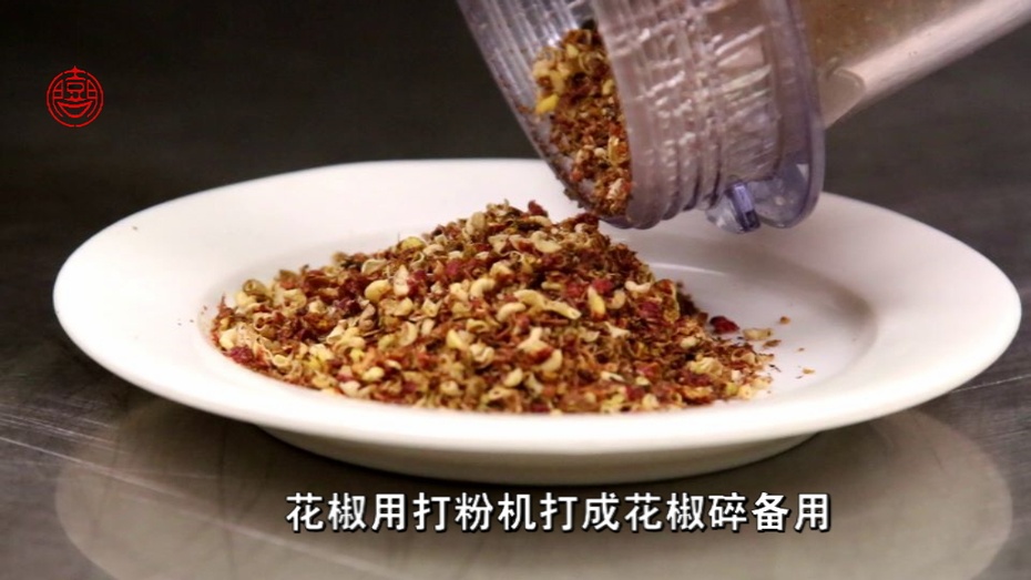 3、蒜蓉適量;姜末適量;豆瓣醬適量;花椒適量,花椒用打粉機打成花椒碎備用。辣椒適量,用打粉機打成辣椒粉備用。