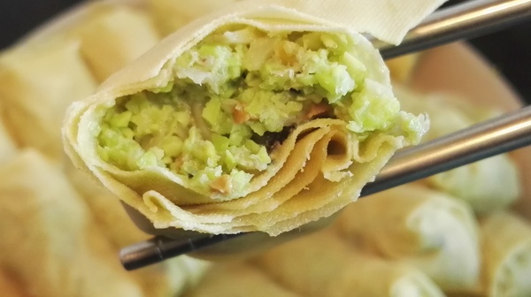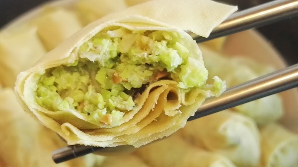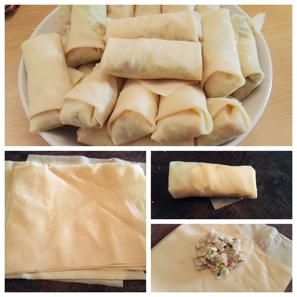 第二步:將薄的千張皮裁成大約12cm*15cm左右的大小,然后將適量的餡料放上,再包成類似春卷一樣的形狀放入盤中。