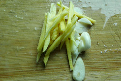 3、鍋里放入適量的油,燒熱, 放入姜和蒜,炒香