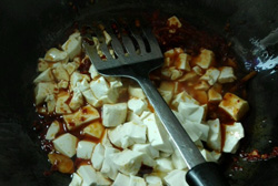 食材主料:豆腐300g、豆豉15顆、牛肉100g、蒜苗2根、姜15g、花生油75g、鹽5g、醬油15g、豆瓣醬20g、花椒粉1.5g、糖5g。