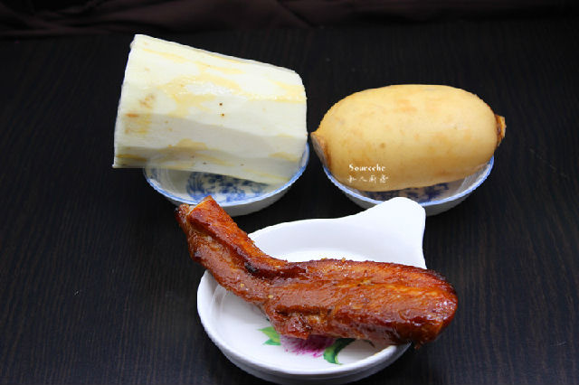 1.準(zhǔn)備食材:叉燒、蓮藕、山藥去皮洗凈;PS:去皮記得戴手套。