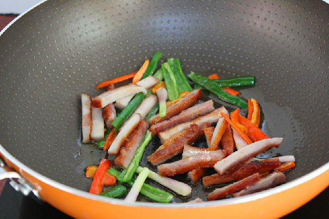 4.熱鍋,倒入橄欖油,放青辣椒、紅辣椒、蔥頭;PS:用甜辣椒,增味鮮甜。
