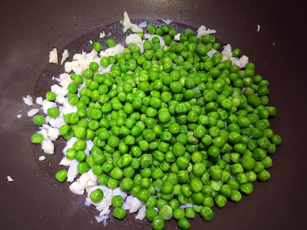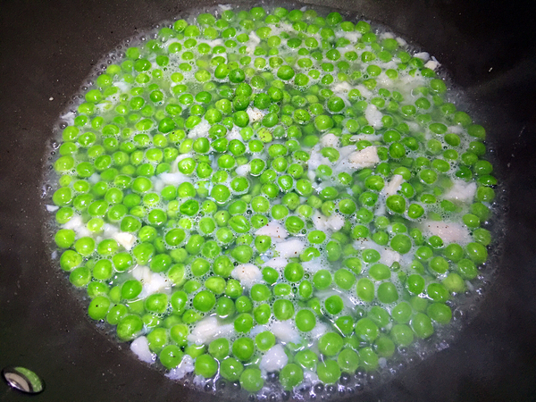 倒入沒過豌豆的水,有高湯更好,放鹽和黑胡椒,一點(diǎn)點(diǎn)生抽,大火燒開直到收汁