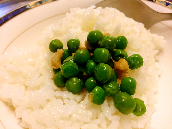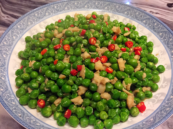 起鍋前放入紅辣椒,雞蓉?fù)?jù)說是1.2個(gè)大氣壓下如何如何做出來的,買的時(shí)候看商品描述覺得就是噱頭,但是吃起來竟然真的很好吃,彈潤(rùn)鮮嫩,不像一般的雞胸肉輕易就柴了,配合著豌豆的鮮甜特別下飯