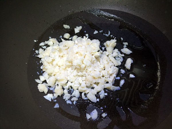 右邊灶眼放入底油燒熱,放入雞蓉劃散