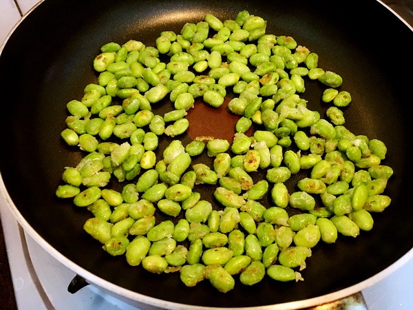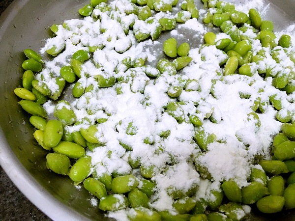 毛豆洗淨(jìng)蒸九成熟,拍干粉,煎至表面酥香
