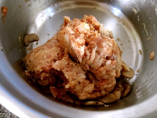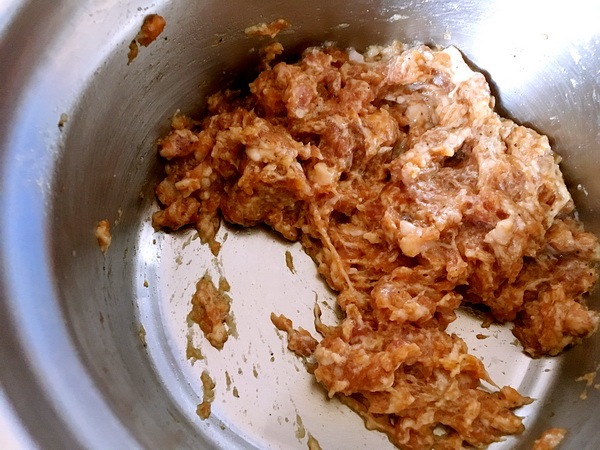 肉泥用生抽,胡椒粉,料酒,糖,打出漿,再拌入干煸蘑菇1/2