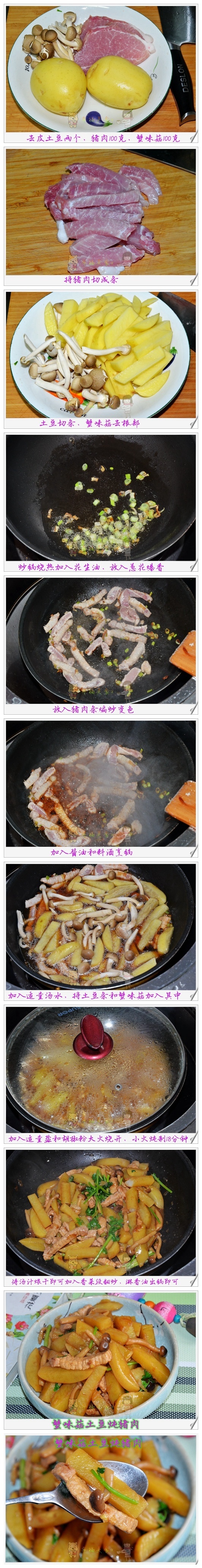 幸福小貼士:1、豬肉如果喜歡吃香一點的,可以換成帶皮豬五花肉,那樣香氣更足一些。2、土豆切條的粗細程度根據(jù)豬肉的品質(zhì),如果是豬后腿肉就不要切太粗,因為豬腿肉不吃火。如果用豬五花肉制作那么就要切的稍微粗一些,這樣多燉一會味道會更好!