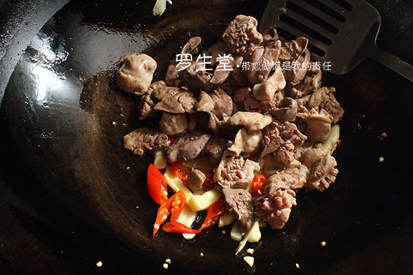 雞雜洗凈后潷水,雞肝和雞心切厚片,雞胗打花刀或者也切厚片備用