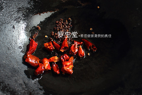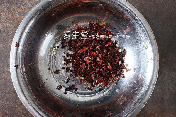 炒鍋內(nèi)放一點(diǎn)點(diǎn)油,先放花椒小火焙至快呈棕色時(shí)下干辣椒炒至棕紅色時(shí)撈出晾涼,用刀鍘碎備用