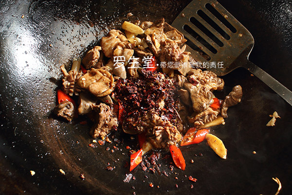 接著下炒好的雞雜,大火煸炒,放醬油鹽和糖,再炒至雞雜全熟